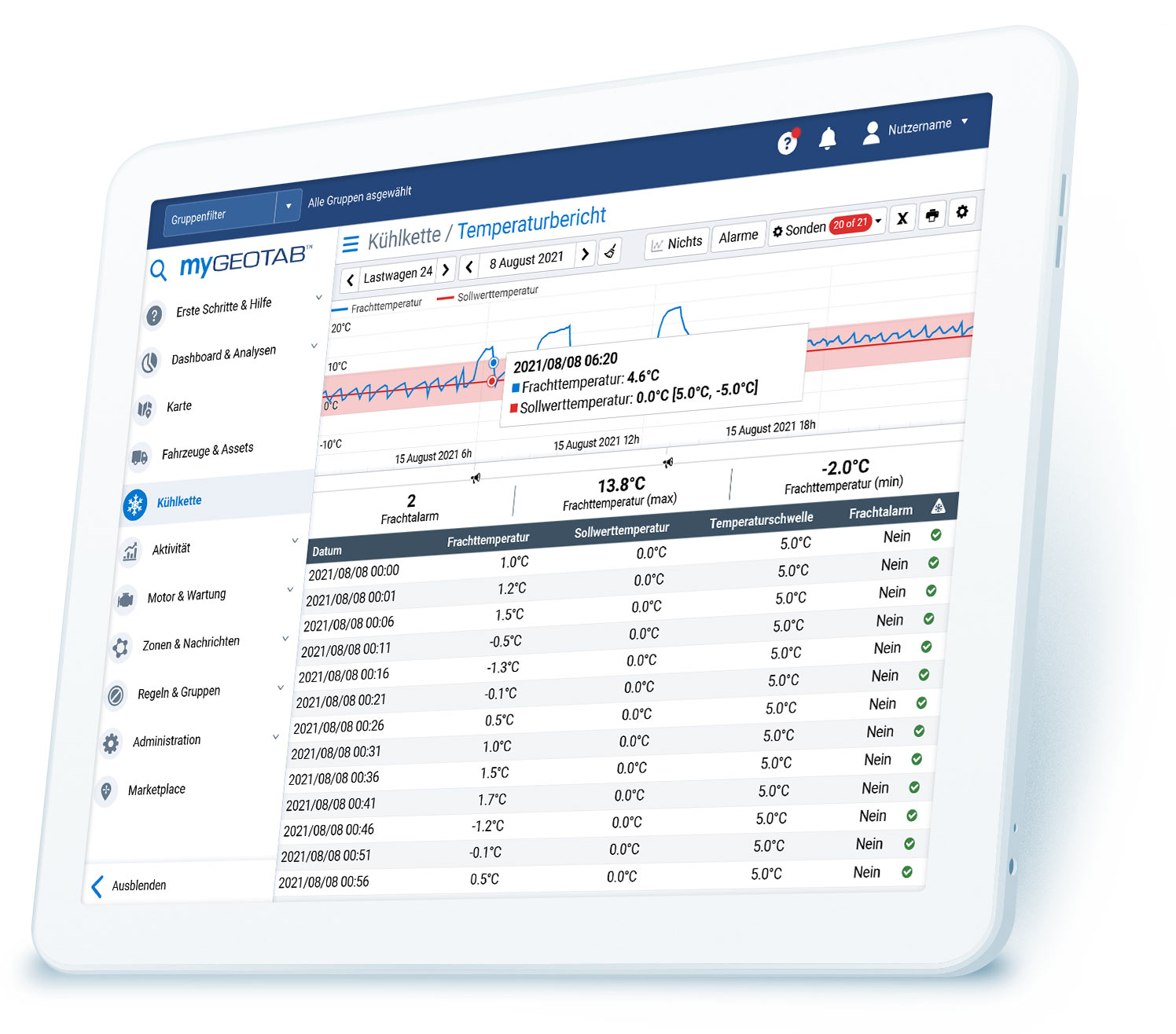 Das Cold Chain Monitoring System läßt sich über das Cold Chain Software Add-in nahtlos in unsere Telematik Lösung "fleetbay connect" integrieren. Die parallele Verwaltung zusätzlicher Software-Systeme wird dadurch überflüssig. Über die Telematik Plattform MyGEOTAB lassen sich alle erfassten Kühltransport-Daten gemeinsam mit allen weiteren Fuhrpark-Daten zentralisiert zusammenführen, auswerten und managen.